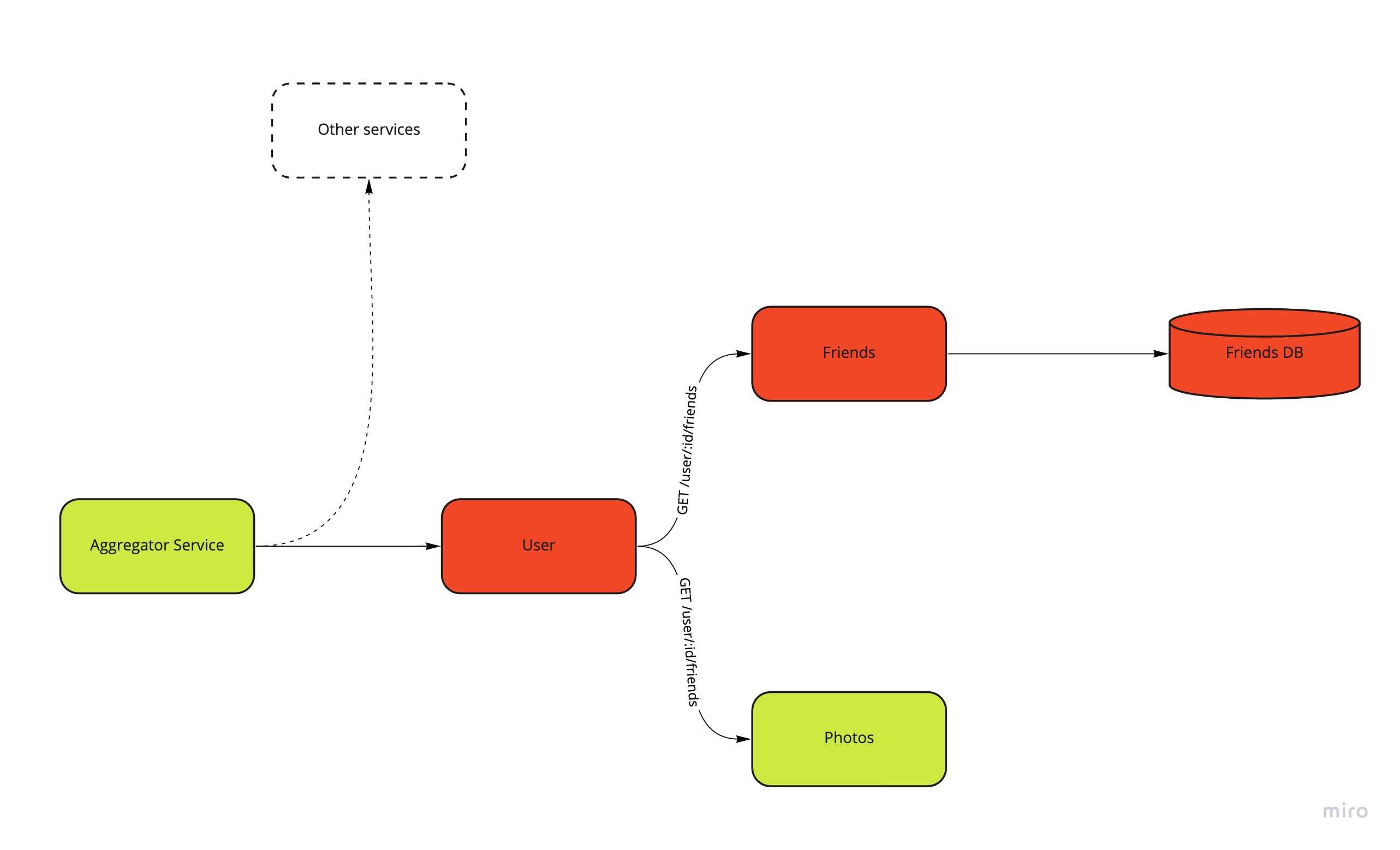 Let’s walk through an example of a social media application to understand this better. Here we have an aggregator service which is what the client interacts with, it aggregates results from a bunch of services including user service. User service calls photo service and friends service which in turn calls friends_db.
