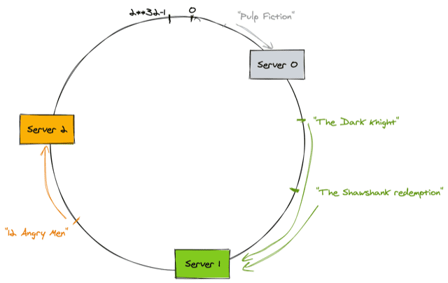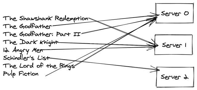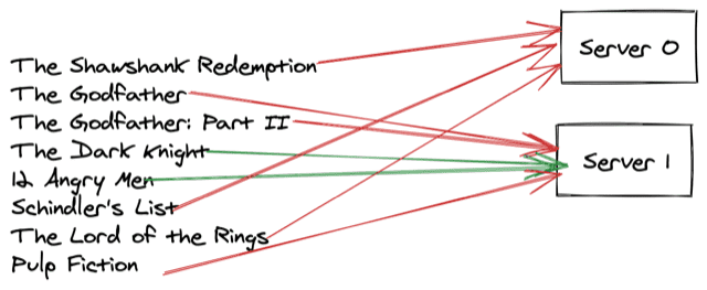 As you can see once of of the servers go down we have to almost all of our keys point to different servers, case in point “The Shawshank redemption” which was assigned server 1 now points to server 2 and hence is marked with a red arrow in the diagram above. This is going to cause a lot of cache misses and defats the purpose of the cache.