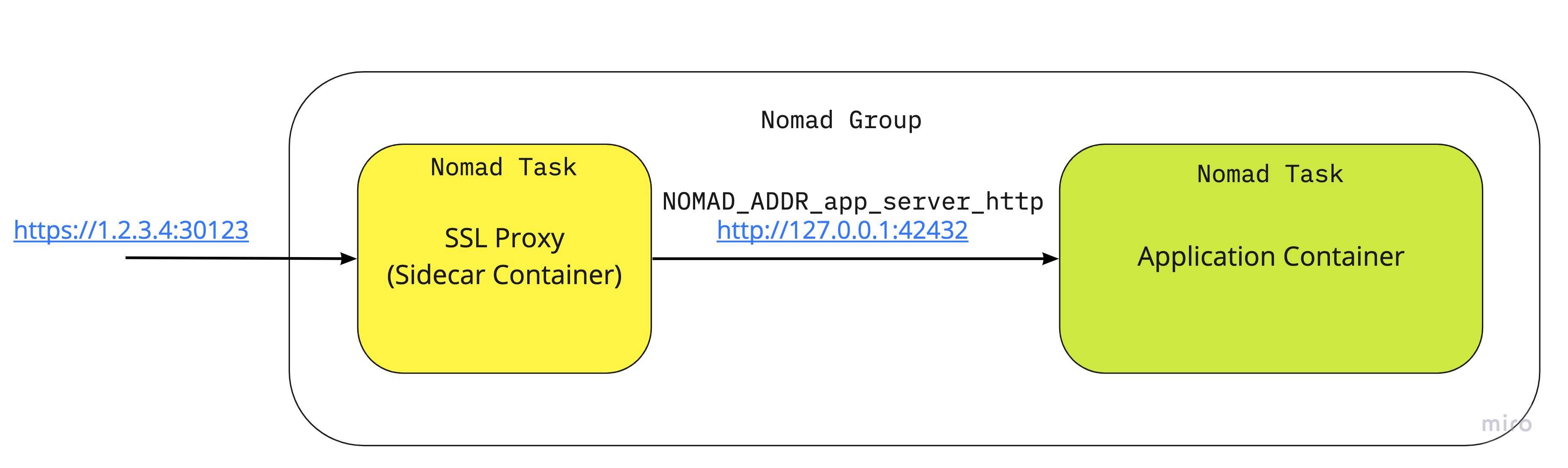 To enable this we create a new task called ssl-proxy-sidecar which mounts the SSL certificate and the SSL certificate key. It also proxies all traffic to NOMAD_ADDR_app_server_http which is how nomad makes the application container’s HTTP port available as an environment variable.